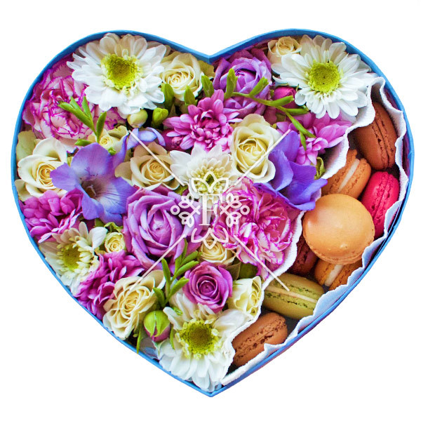 Хризантема белая - 1 шт., хризантема фиолетовая - 1 шт., эустома фиолетовая - 1 шт., роза белая - 5 шт., гвоздика сиреневая - 2 шт., фрезия фиолетовая - 2 шт., оазис, фетр белый, макарунс - 8 шт., коробка в виде сердца (20х20см).